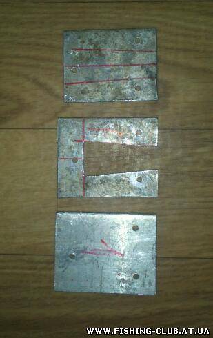 | С лева на право 1)Основная пластина 8мм в ней два отверстия 6/6мм под заклепки для контейнера и три отверстия сквозных для крепления всей конструкции вместе.2)П-образная пластина 3 4 5 6мм смотря какой вес кормушки нужен ширина и глубина в П-образке под грузок 20/50мм в ней три сквозных отверстия как в предыдущей.3)пластина 1-2мм сплошная с тремя сквозными отверстиями.Все 3 пластины размером 70/70мм.Принцип действия:собираем конструкцию в одно целое зажимаем в ювелирные тиски из проволки делаем петельку длиной 30мм на концах загибаем не большие крючки вставляем в форму по центру заливаем свинец остужаем в воде вынимаем грузок процедуру повторяем заново.вся конструкция выполнена из ст3 но если есть возможность лучше из аллюминия. можно сделать комплект для сильного течения в пластинах пропиливаются пазы для проволки в виде ромба